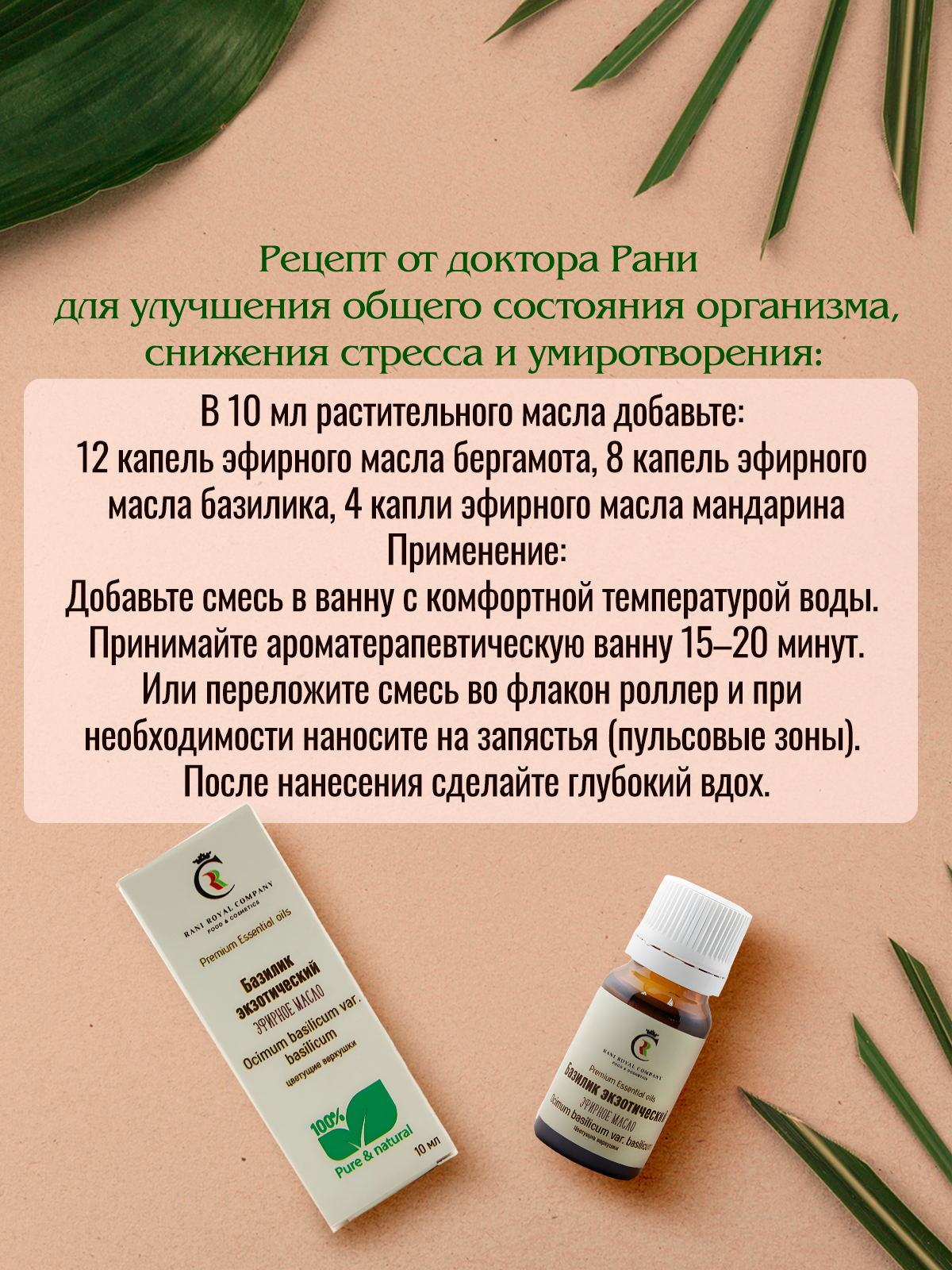 Масло базилика дарит умиротворенность и ясность ума, нейтрализует негативные эмоции и очищает разум. Научно доказано, что оно стимулирует выработку серотонина — гормона удовлетворенности, а также действует как мощный антиоксидант.