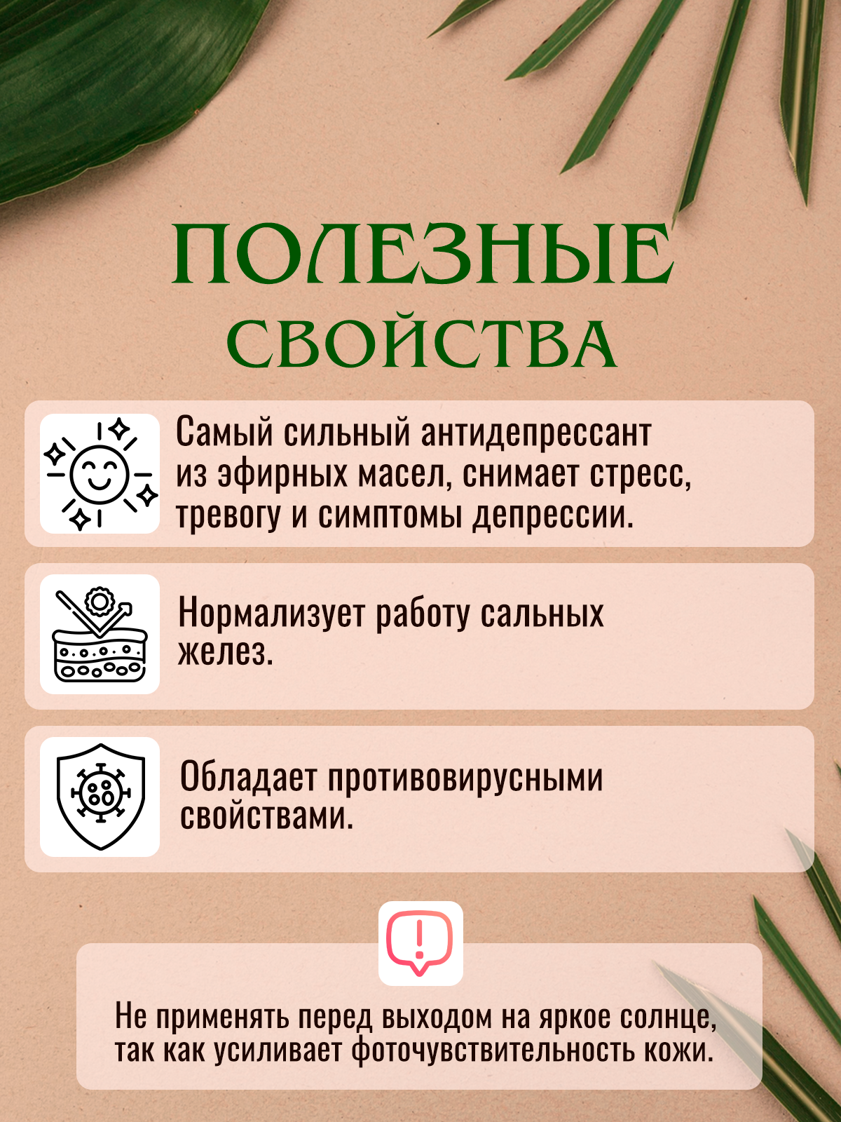 Польза: Снимает стресс, тревожность, апатию. Самый сильный антидепрессант среди эфирных масел. Научно доказана эффективность в снижении гормонов стресса. Сильное противовирусное действие.
