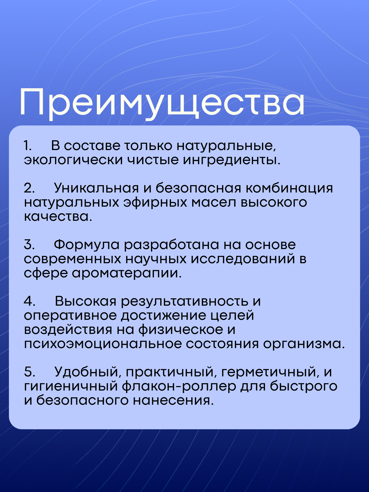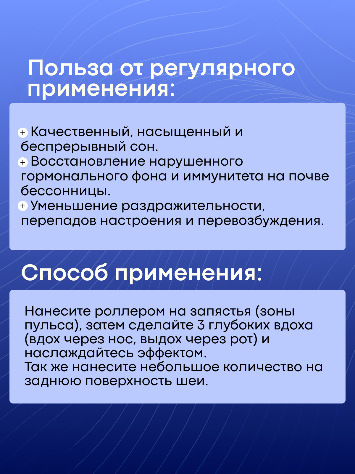Нанесите роллером на запястья (зоны пульса), затем сделайте глубокий вдох и наслаждайтесь эффектом.