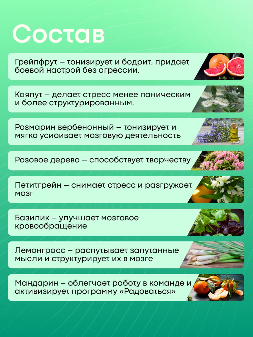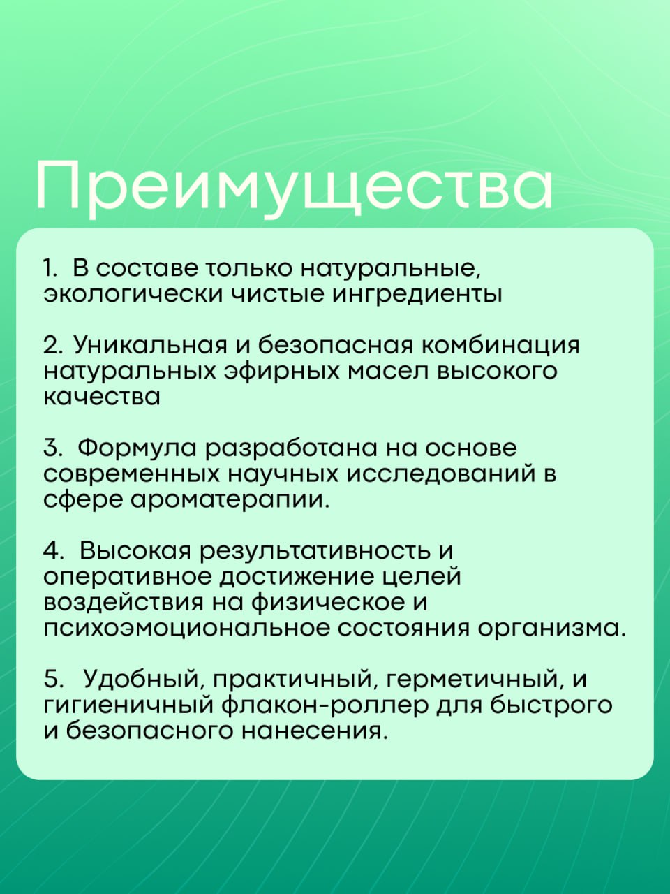 Способ применения: Нанесите роллером на запястья (зоны пульса), затем сделайте глубокий вдох и наслаждайтесь эффектом.