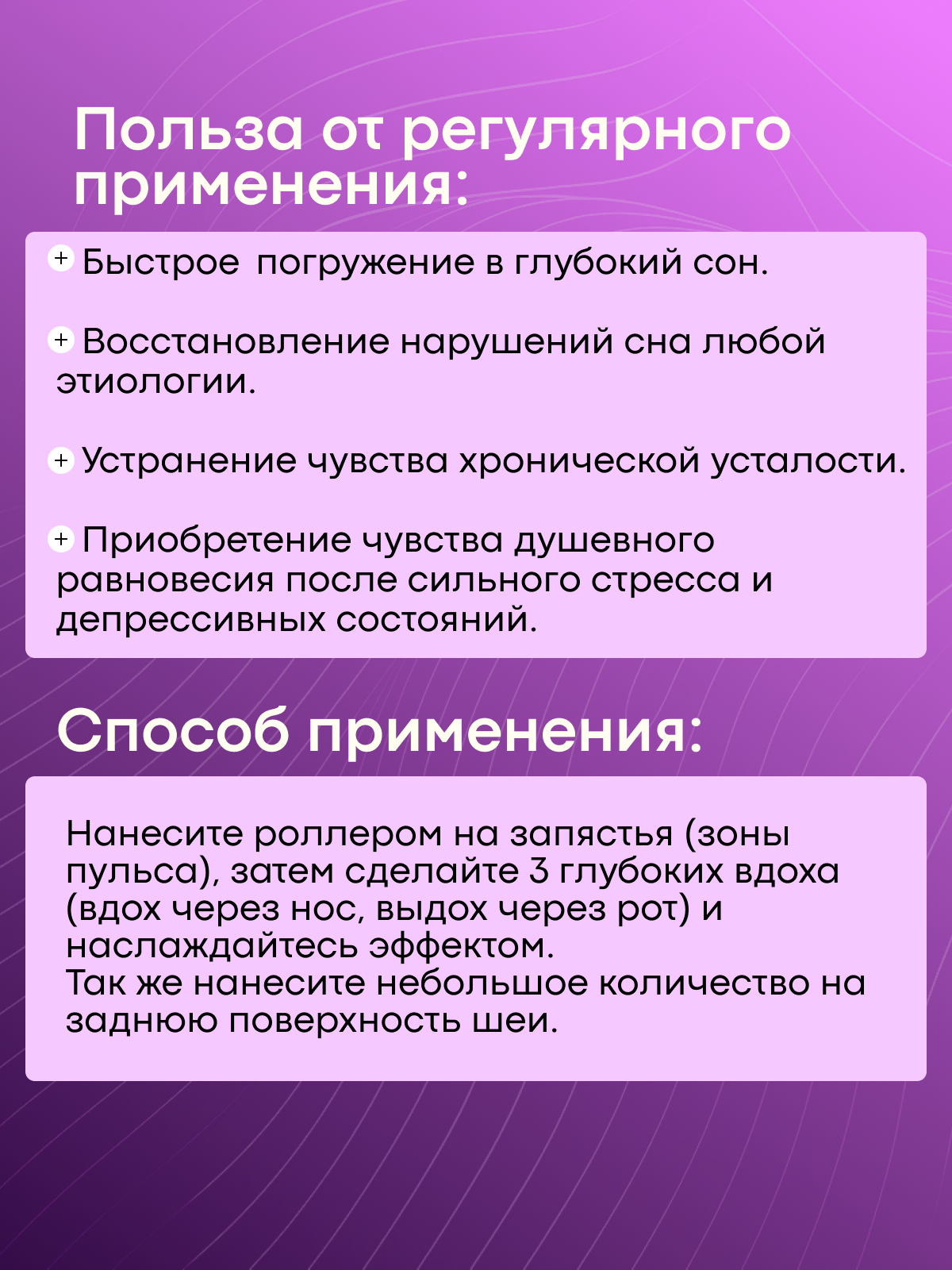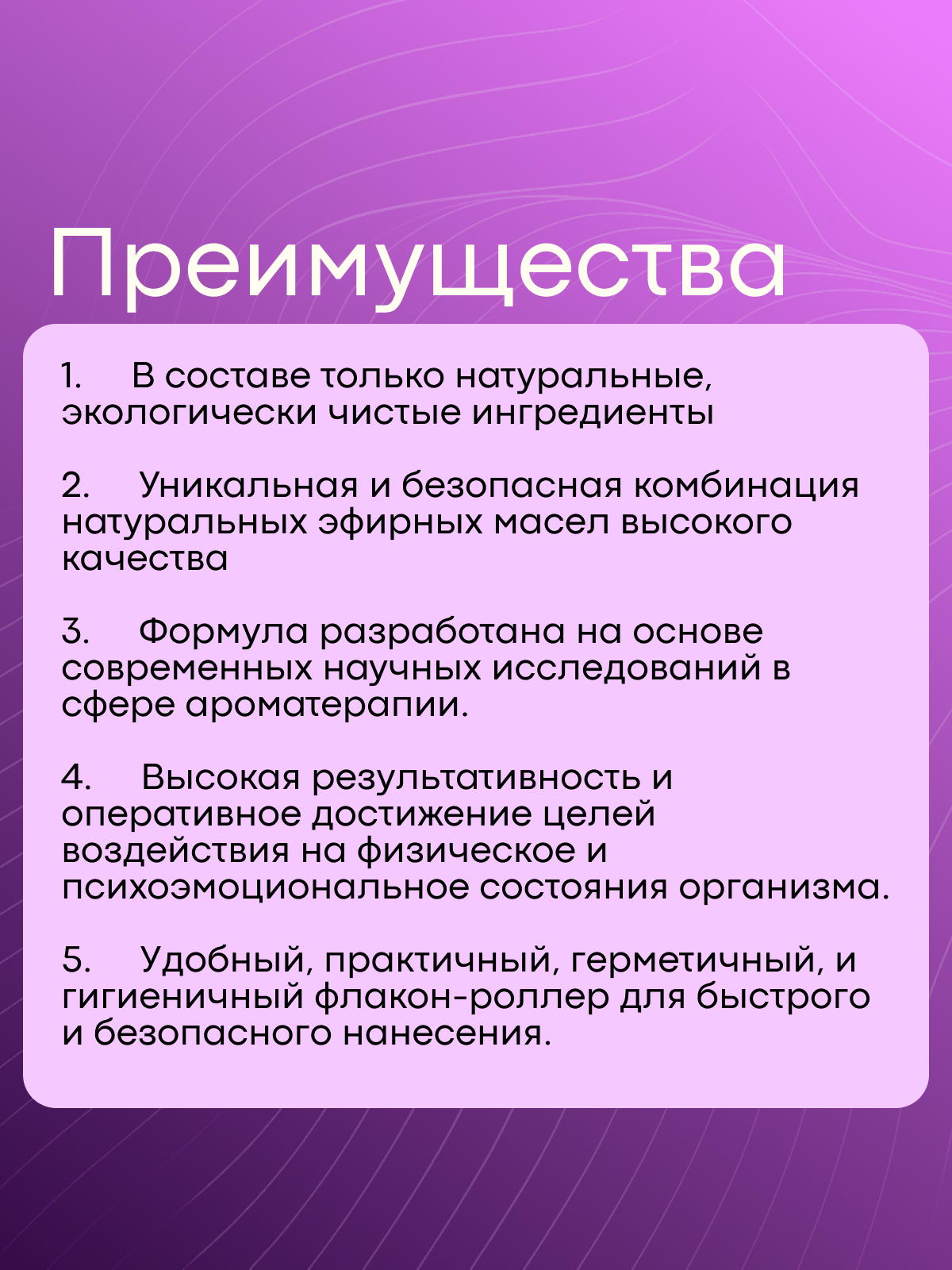Нанесите роллером на запястья (зоны пульса), затем сделайте глубокий вдох и наслаждайтесь эффектом.