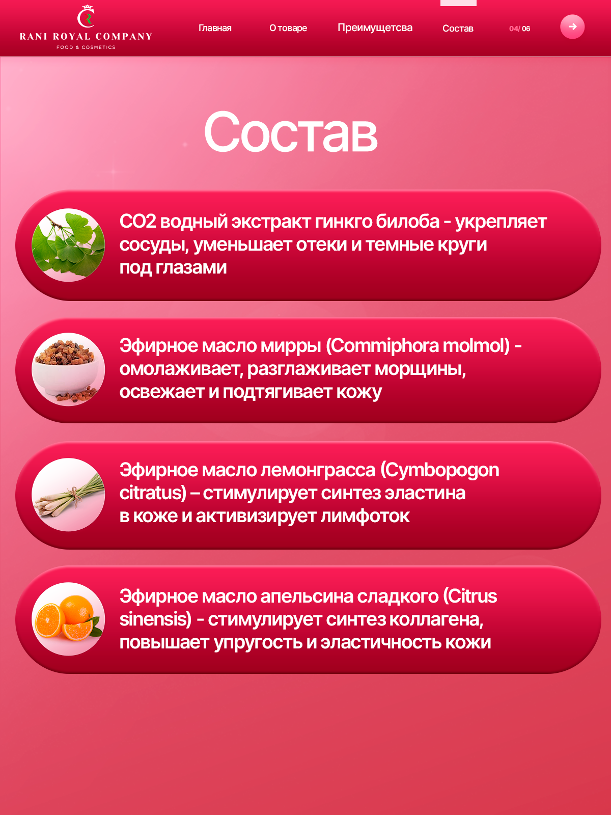 Состав: вода, СО2 водный экстракт розы, СО2 водный экстракт пажитника, СО2 водный экстракт гинкго билоба, , масло шиповника, коньяк маннан, , эфирные масла: Розмарин камфорный (Rosmarinus officinalis ct camphre), пачули (pogostemon cablin),Герань (Pelargonium x asperum), мирра (Commiphora molmol), сандал (santalum austrocaledonicum var. austrocaledonicum), лемонграсс (cymbopogon citratus), апельсин сладкий (citrus sinensis), герань (pelargonium x asperum), пальмароза (Cymbopogon martinii var, motia), Розовое дерево (aniba rosaeodora), мирт цинеольный (Myrtus communis), Polyglyceryl-2 Dipolyhydroxystearate, Ethylhexylglycerin, Benzyl Alcohol, Phenoxyethanol